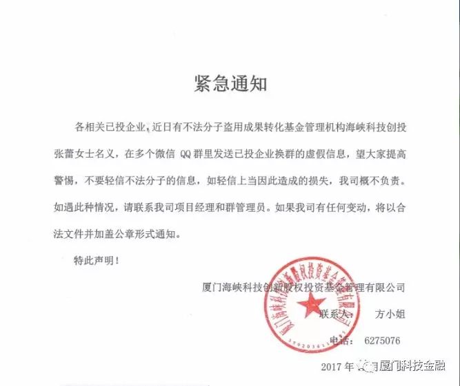 各相關(guān)企業(yè),近日有不法分子盜用科技成果轉(zhuǎn)化基金管理機(jī)構(gòu)海峽科技創(chuàng)投名義,在多個(gè)微信 QQ群里發(fā)送已投企業(yè)換群或重要工作安排的虛假信息,望大家提高警惕,不要輕信不法分子而泄露信息,如輕信上當(dāng)因此造成的損失,我司概不負(fù)責(zé)。如遇此種情況,請(qǐng)聯(lián)系我司項(xiàng)目經(jīng)理和群管理員。如我司有任何工作方面的變動(dòng),將以合法文件并加蓋公章形式通知。